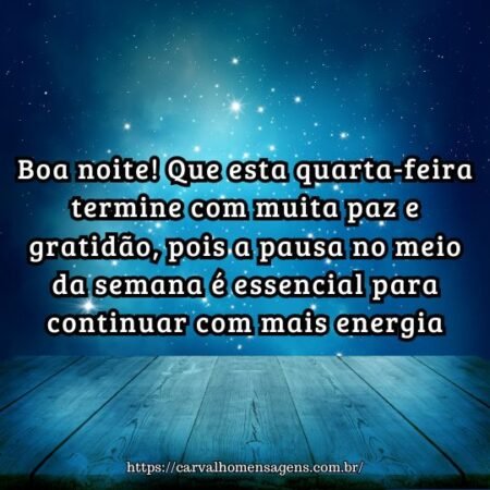 Feliz quarta-feira à noite! Que seu descanso seja profundo e restaurador, pois a quarta é o ponto de equilíbrio para conquistar uma semana produtiva.