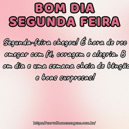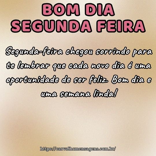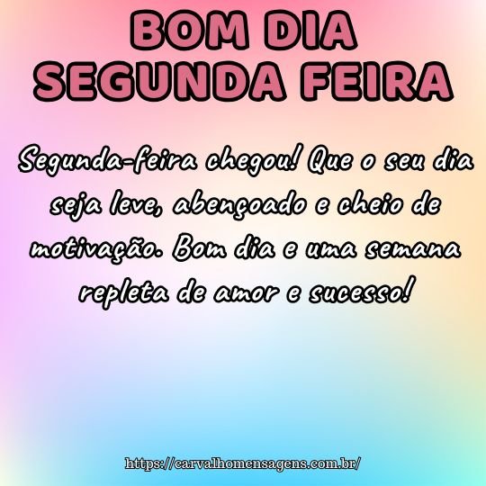 Feliz segunda-feira! Que seu dia seja leve e produtivo, e que esta semana seja marcada por bênçãos, boas surpresas e sorrisos sinceros.