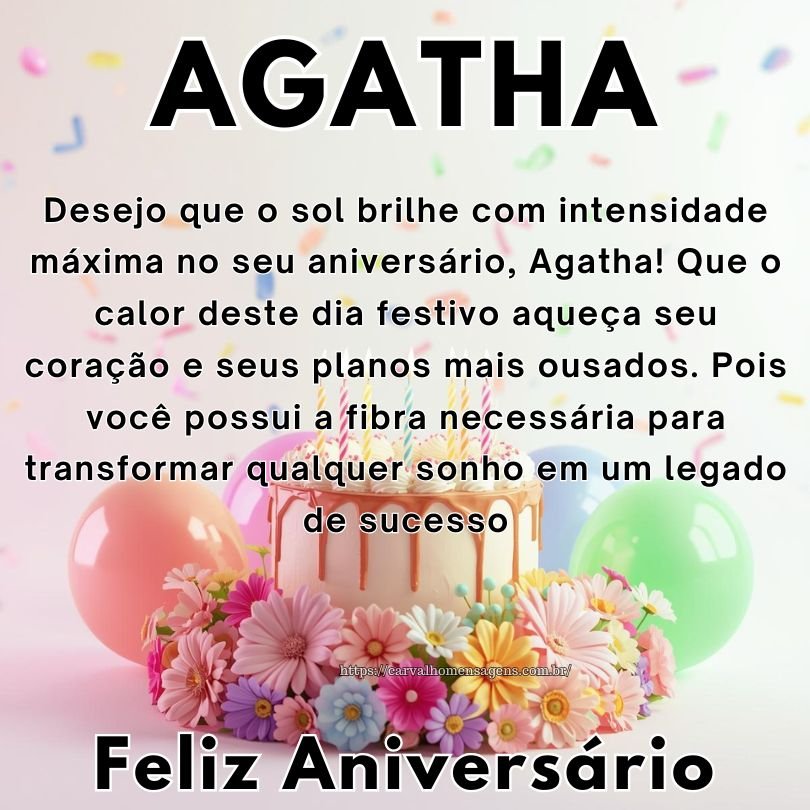 Agatha, que a abundância de sorrisos e gargalhadas seja a tônica deste seu aniversário! Transforme a felicidade de hoje na sua rotina para todos os dias do ano. Pois um espírito alegre é um ímã poderoso para atrair saúde, sorte e prosperidade constante.