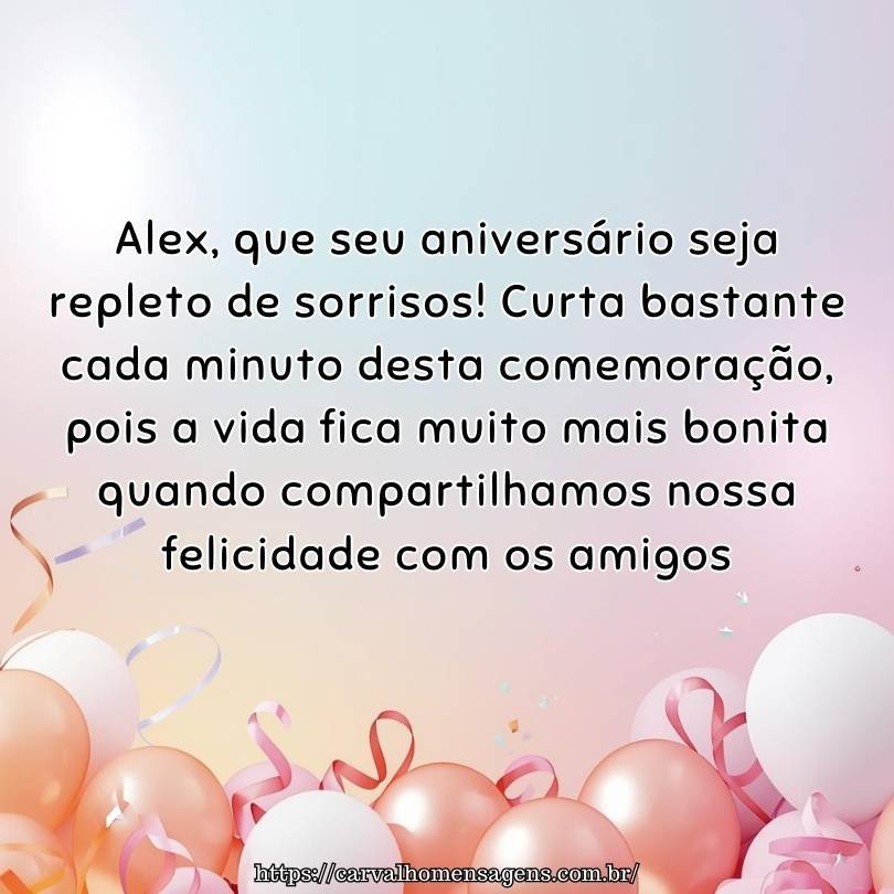 Feliz aniversário para você Alex, com muita festa! Aproveite cada brinde para mentalizar coisas boas, pois o universo reserva momentos brilhantes para quem mantém a esperança sempre viva.