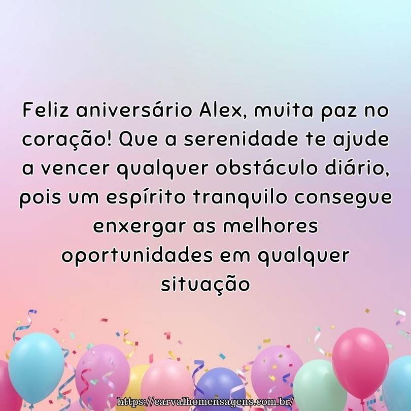 Tenha um aniversário maravilhoso Alex! Que a paz invada sua casa nesta data festiva, pois não existe nada melhor do que celebrar cercado de harmonia e pessoas verdadeiras.