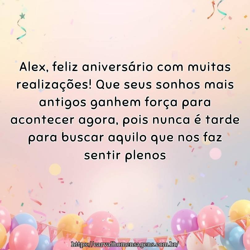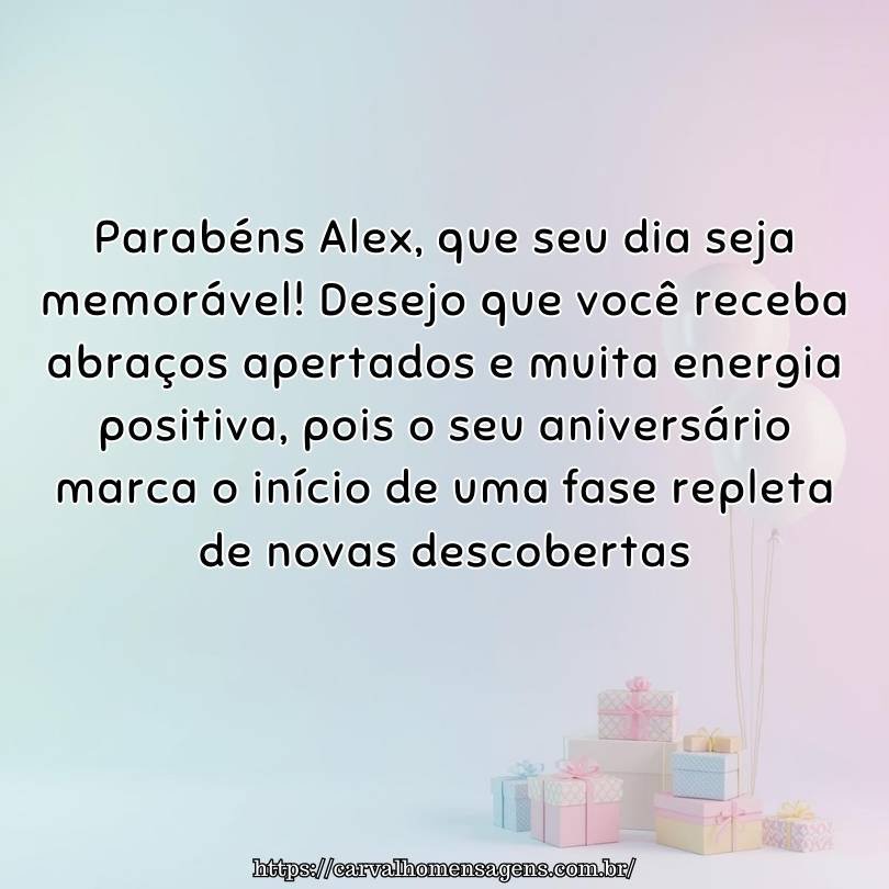 Parabéns Alex, muitas bênçãos hoje e sempre! Termine este aniversário com a certeza de que o melhor ainda está por vir, pois sua jornada será iluminada pelo sucesso.