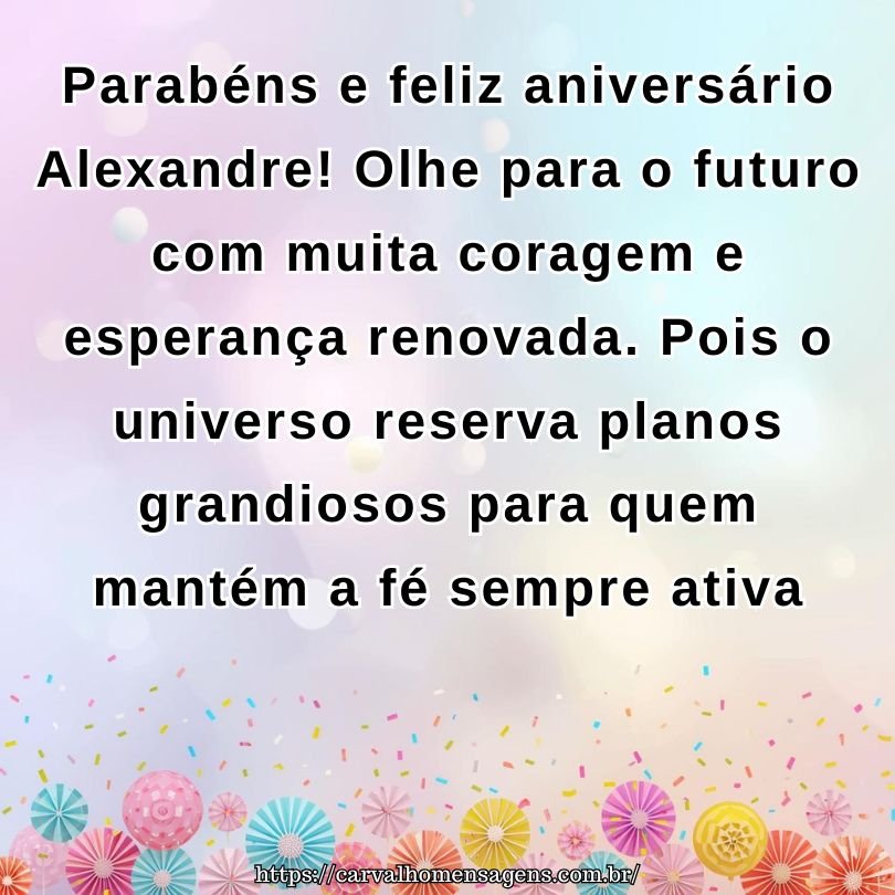 Parabéns e feliz aniversário Alexandre! Olhe para o futuro com muita coragem e esperança renovada. Pois o universo reserva planos grandiosos para quem mantém a fé sempre ativa