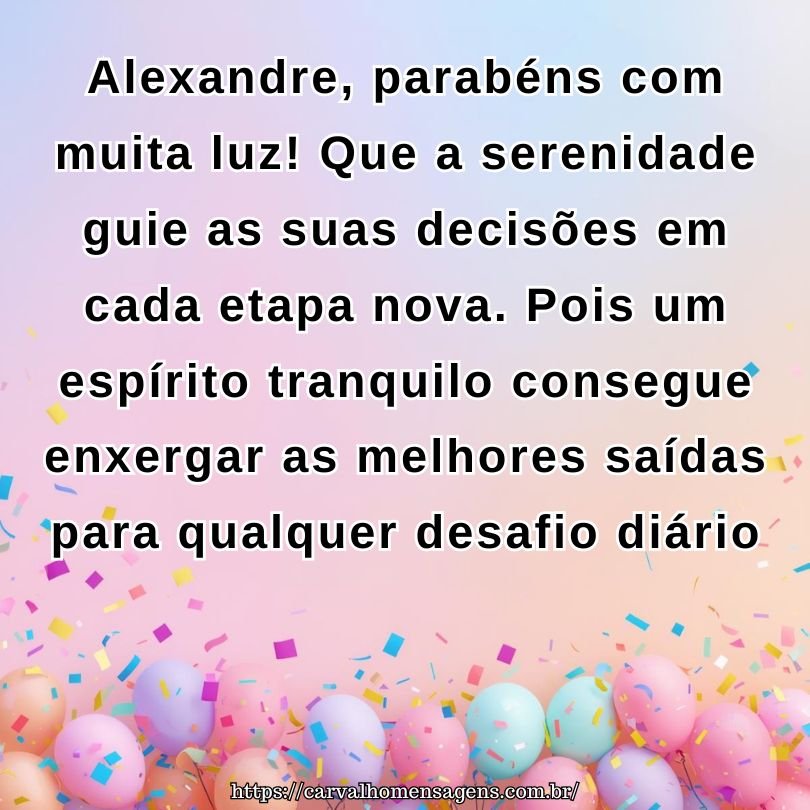 Alexandre, parabéns com muita luz! Que a serenidade guie as suas decisões em cada etapa nova. Pois um espírito tranquilo consegue enxergar as melhores saídas para qualquer desafio diário.