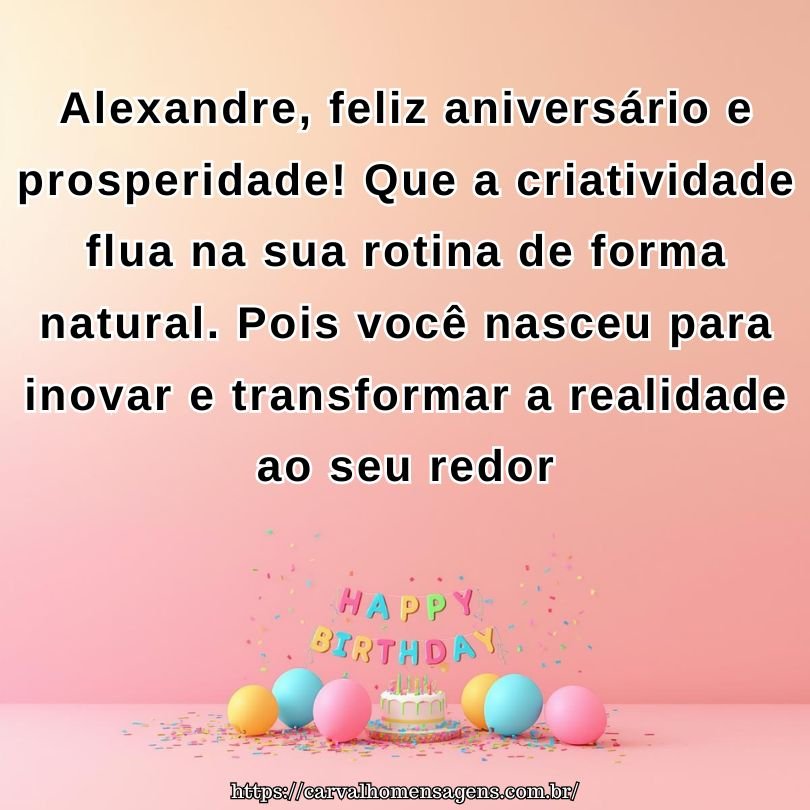 Alexandre, feliz aniversário e prosperidade! Que a criatividade flua na sua rotina de forma natural. Pois você nasceu para inovar e transformar a realidade ao seu redor