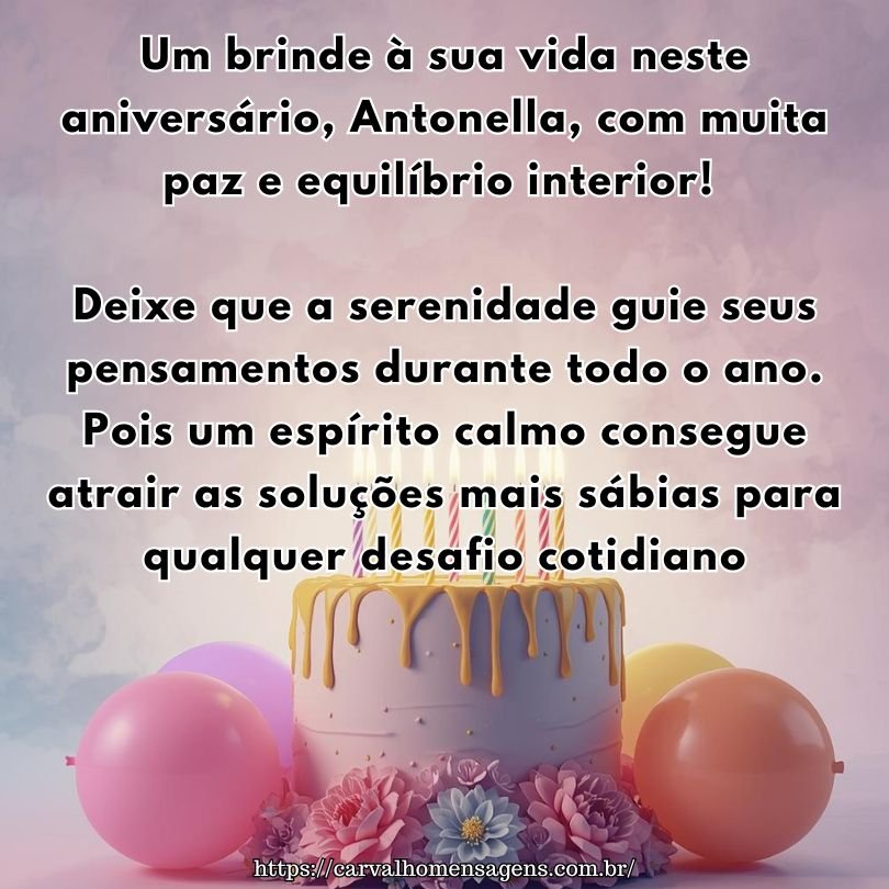 Um brinde à sua vida neste aniversário, Antonella, com muita paz e equilíbrio interior! Deixe que a serenidade guie seus pensamentos durante todo o ano. Pois um espírito calmo consegue atrair as soluções mais sábias para qualquer desafio cotidiano.