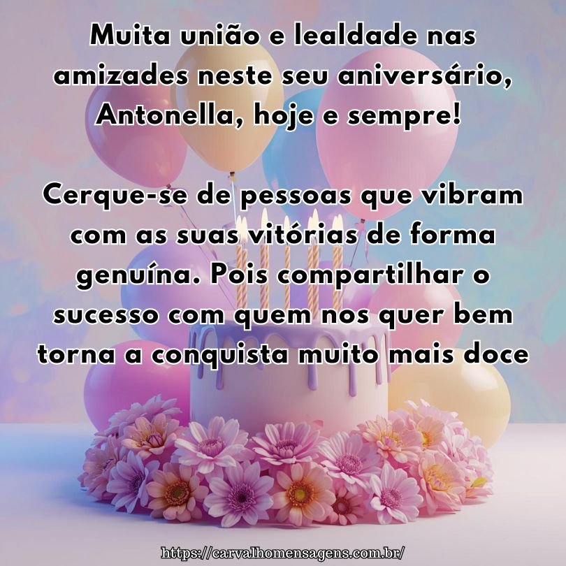 Antonella, receba as melhores vibrações do universo neste aniversário encantador! Que cada mensagem de carinho aumente sua autoestima e brilho pessoal. Pois reconhecer o seu valor é a chave para viver uma vida plena e cheia de satisfação.