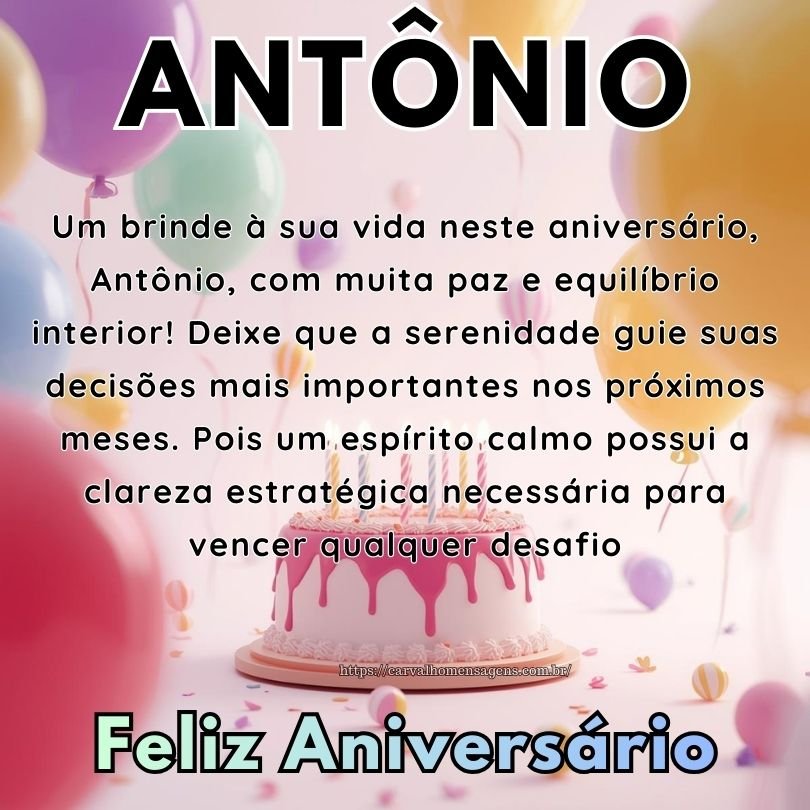 Antônio, curta cada segundo do seu aniversário com muita diversão e boas companhias! Esqueça as obrigações por um momento e foque no prazer de comemorar. Pois celebrar a existência é a melhor maneira de recarregar as energias para as vitórias que virão.