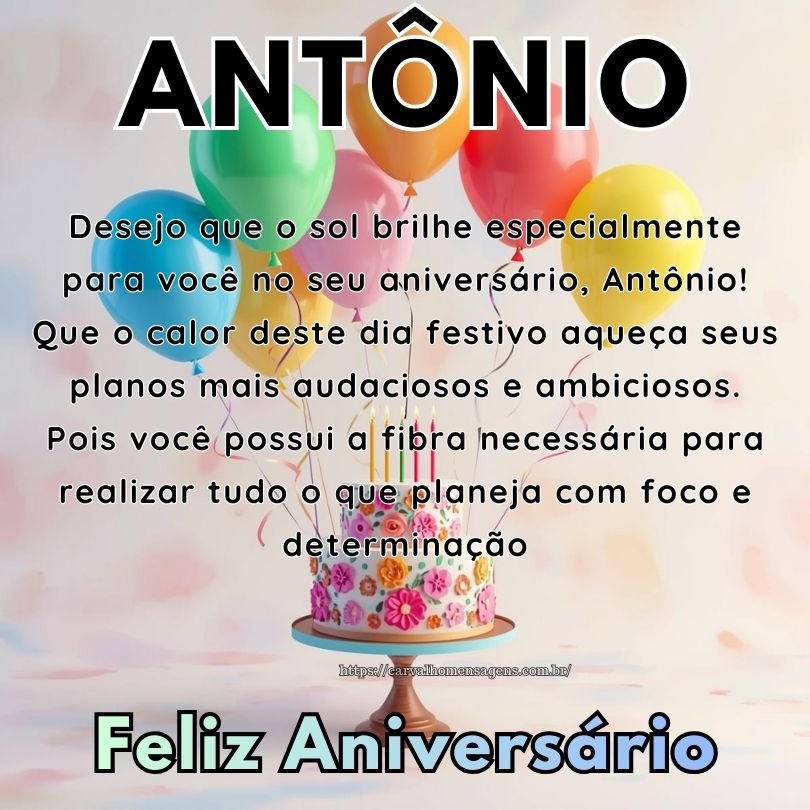 Antônio, que a abundância de motivos para sorrir seja a regra neste seu aniversário! Transforme a vibração positiva desta data no seu combustível diário. Pois um espírito alegre mantém a motivação alta e atrai sorte em todas as áreas da sua vida.